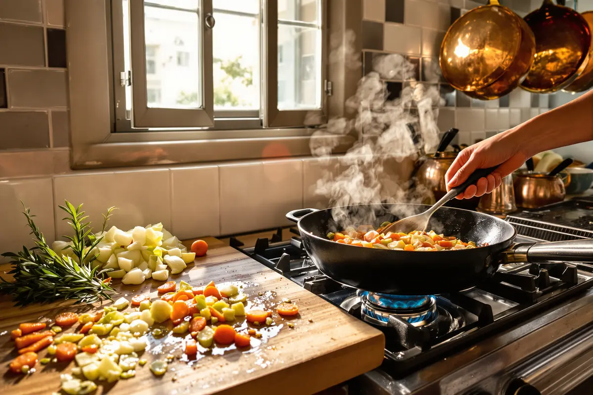 Molti pensano che soffriggere significhi semplicemente far saltare cipolla, sedano e carota per pochi minuti a fuoco vivace. Ma non è così. Questo approccio affrettato ha un solo risultato: un sugo piatto, senza profondità, che lascia il pollo anonimo. Il soffritto, invece, è l’anima del piatto. È lì che inizia la magia.